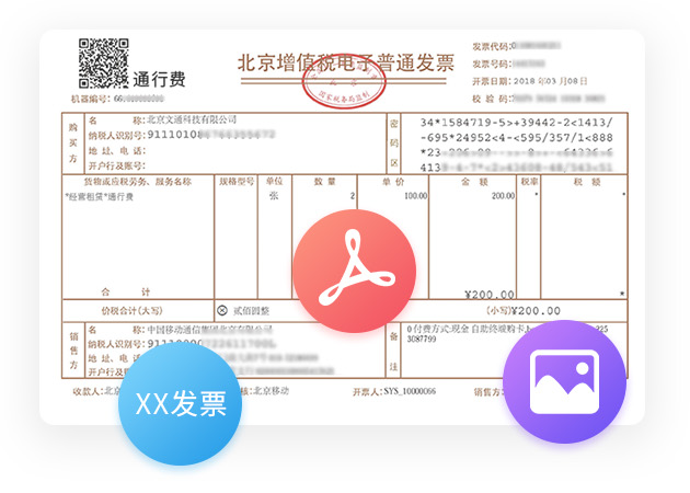 三、发票扫描录入系统后,自动进行影像留存,省去高拍仪拍照存储过程,同时还支持按照票面信息自定义命名,一键导出PDF/JPG格式发票影像,方便历史发票查询,省时省力。