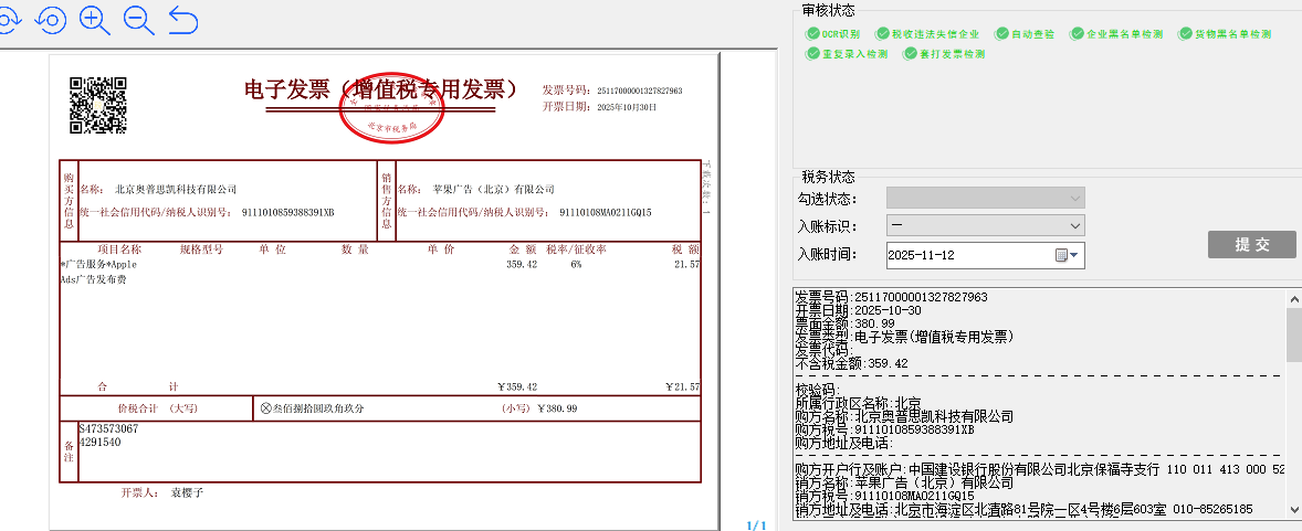 税务申报与审计: 快速整理与查验进项税发票,为合规申报提供支撑。