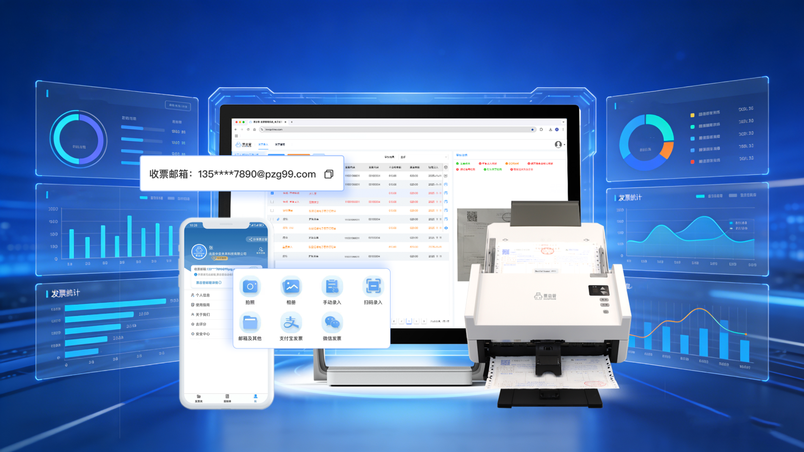 针对上述痛点,票总管网页版SaaS平台通过技术驱动与流程重构,打造覆盖“收票—验真—查重—审核—入账—归档”全链条的智能管理体系,真正实现“让每一张发票都可管、可控、可溯”。二、全链路智能化,构建发票管理新范式智能归集,多渠道自动收票票总管支持企业配置专属收票邮箱,在客户开票时直接填写该邮箱,电子发票和数电票即可自动归集至系统发票夹,无需人工下载或转发。同时,用户还可通过PC端、手机相册、微信/支付宝卡包、浏览器分享等方式一键导入PDF、OFD、XML等主流格式发票,纸质发票则可通过手机拍照或扫描仪批量上传,OCR技术自动识别关键字段,准确率高达99%以上。风控前置,筑牢财税安全防线平台深度集成国家税务总局权威查验通道,实现发票自动验真,并创新性引入多项风控能力:- PS及套打发票检测:通过图像分析与数据比对,精准识别篡改、伪造发票,杜绝虚假票据入账;